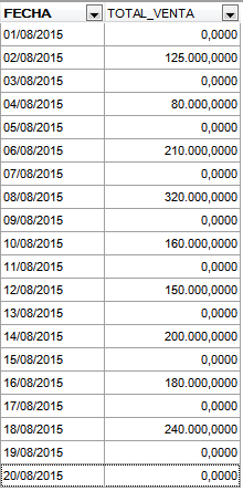Como puedes ver en la Captura 2. se muestran todas las fechas entre el 1 de agosto y el 20 de agosto (porque esas fueron las que elegimos, podríamos haber elegido cualquier otro rango de fechas) con el total vendido cada uno de esos días. Si en una fecha no hubo ventas, entonces se muestra cero.